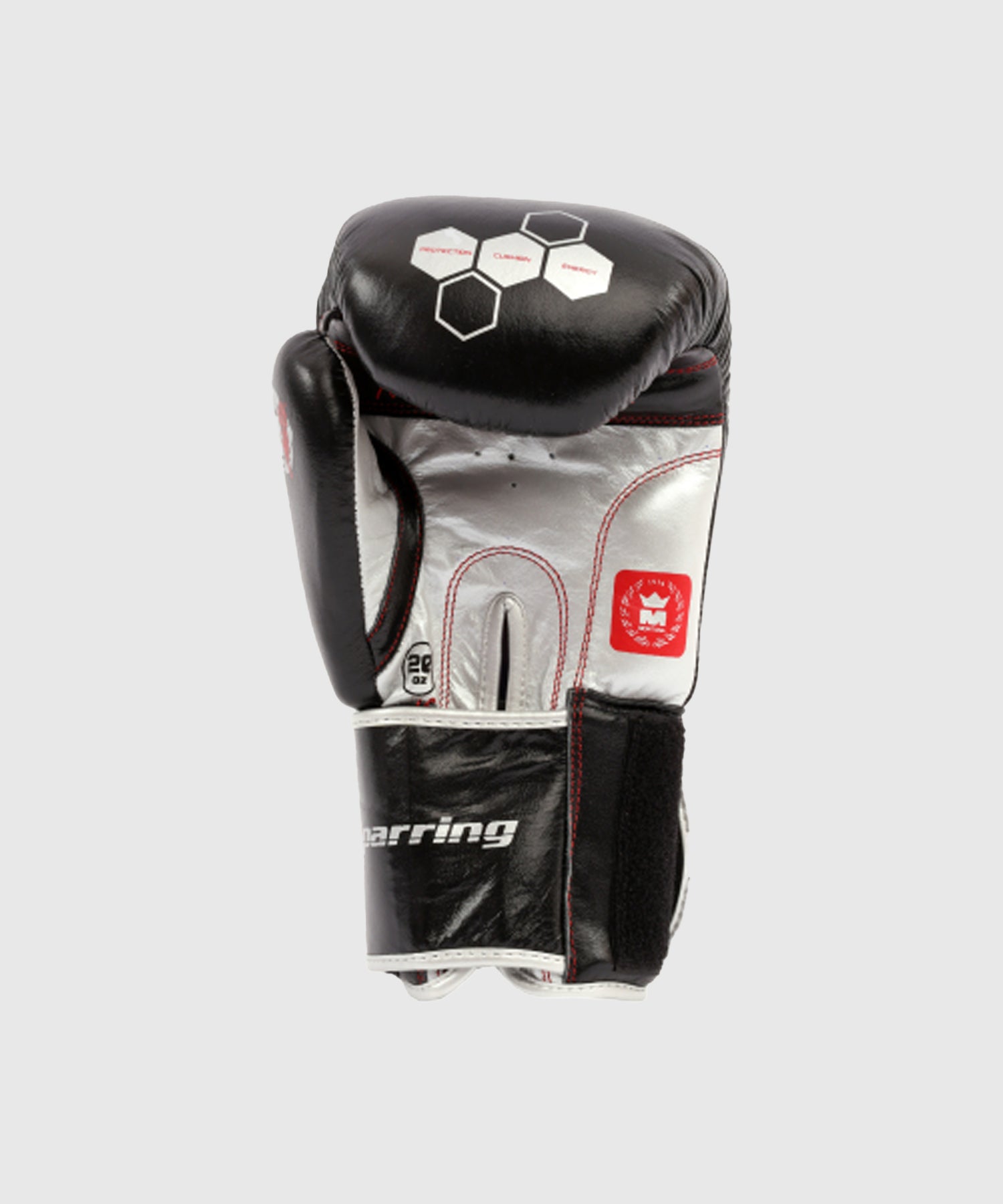 "Sparring" training gloves crafted from premium cowhide leather, designed for multi-discipline boxing. Built with a pre-formed multi-layer "SHOCK ABSORBING" foam block featuring a high-density impact insert for superior protection. Soft satin lining ensures exceptional comfort and quick-drying performance. Finger guards enhance safety, while the "Roll Gripp" system makes fist closure effortless. Leather palm with ventilation for breathability. Wide cuff with elastic tightening and fast, secure Velcro closure.