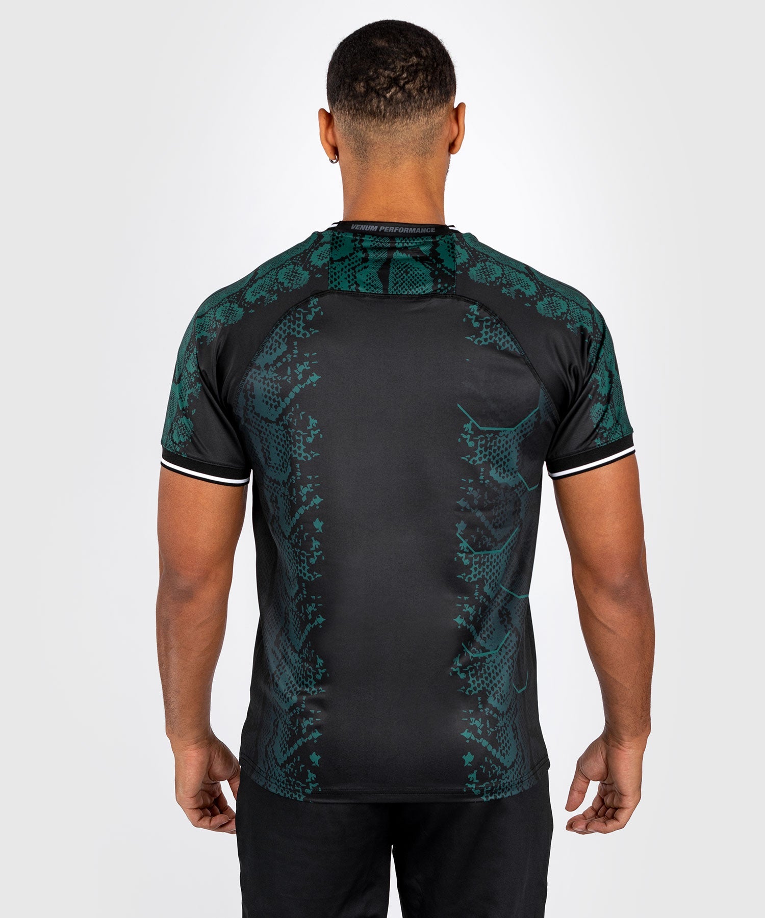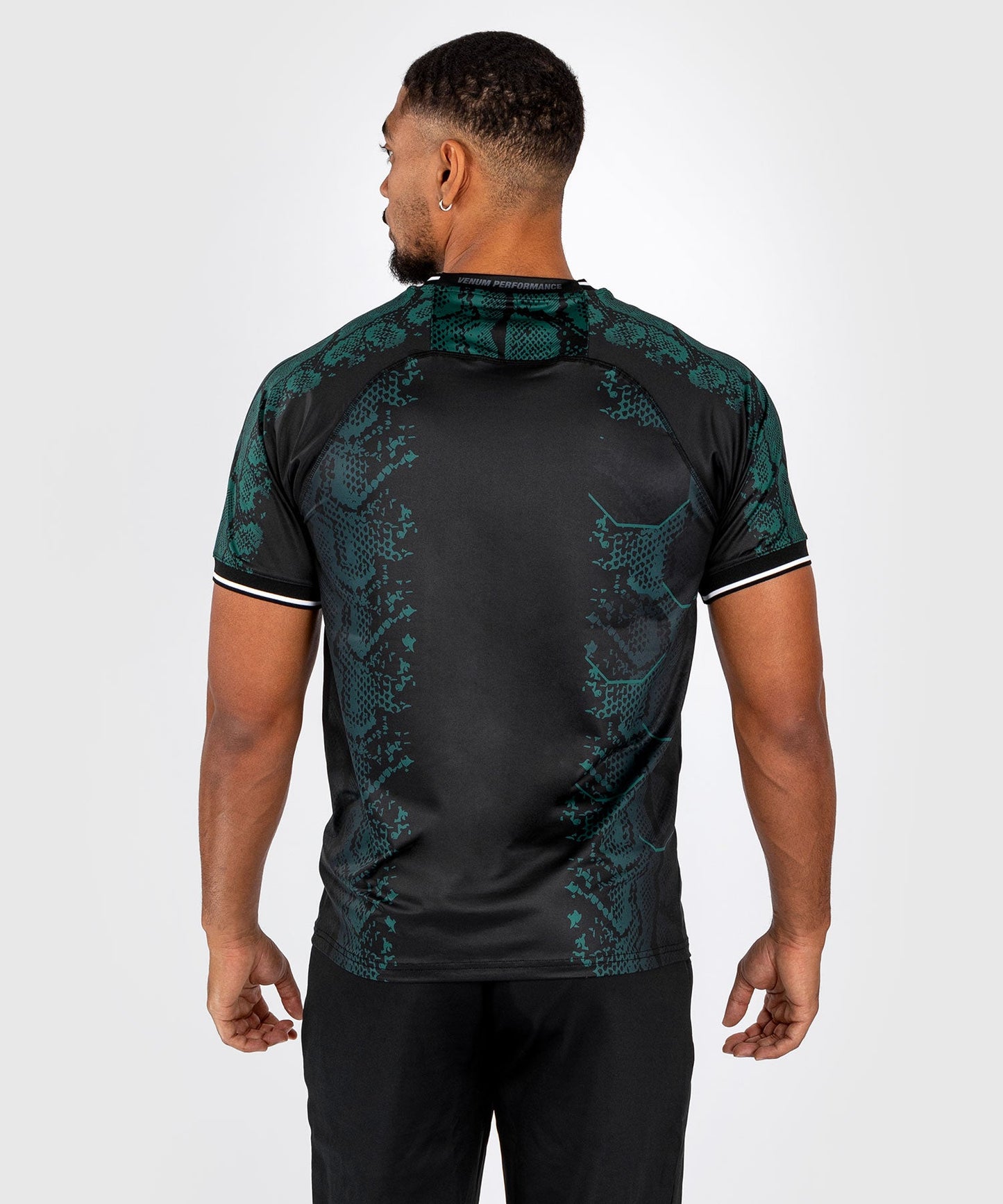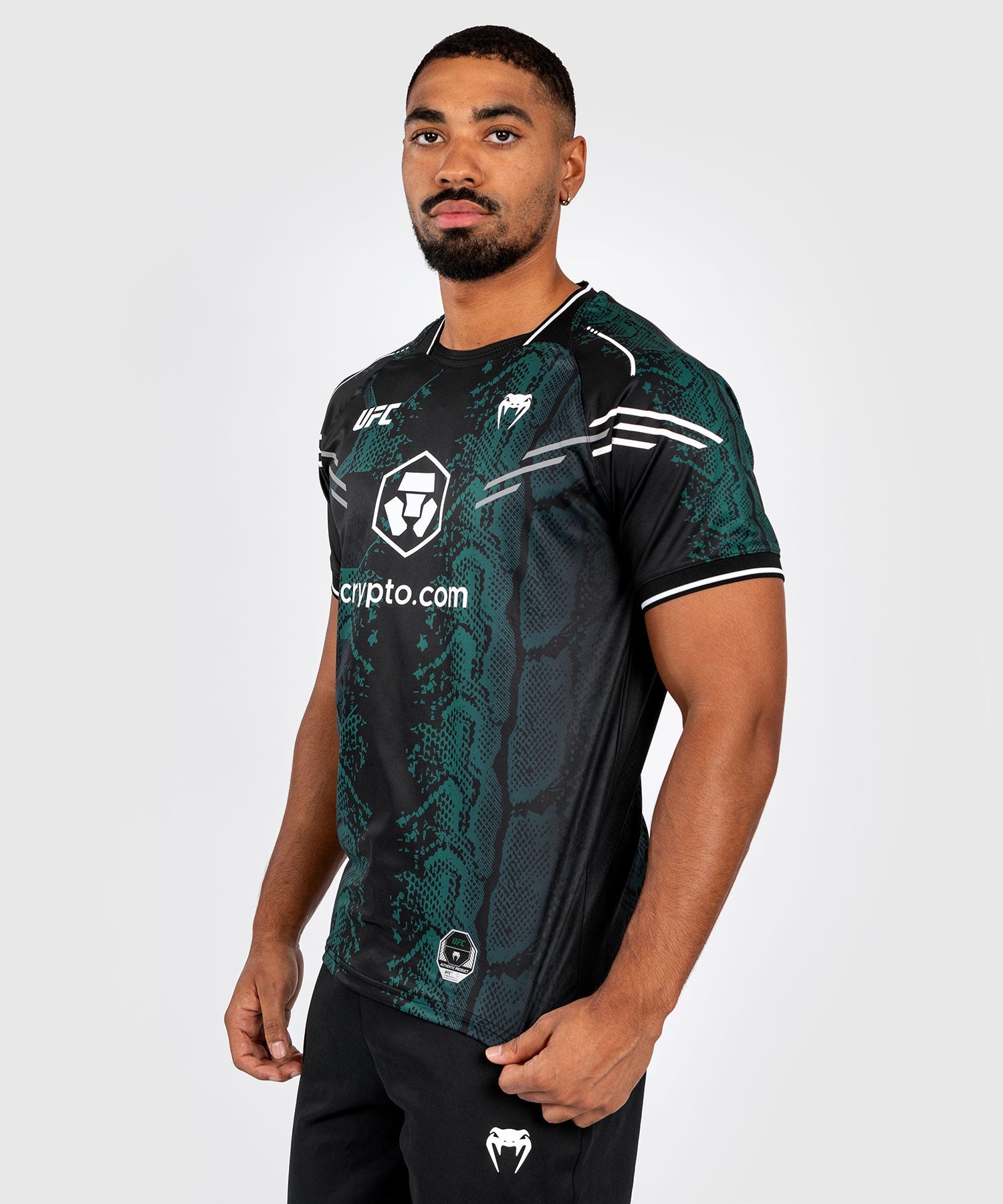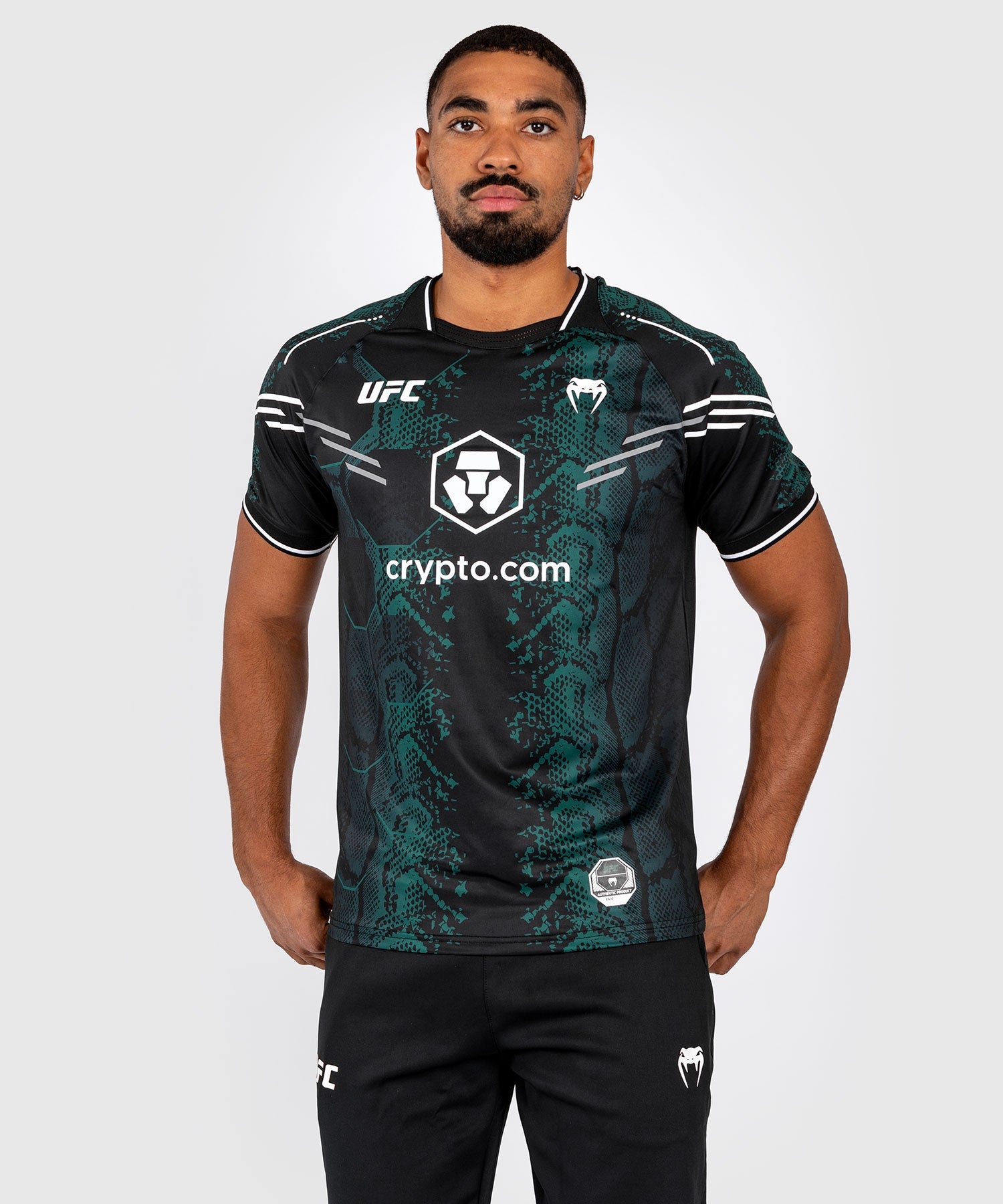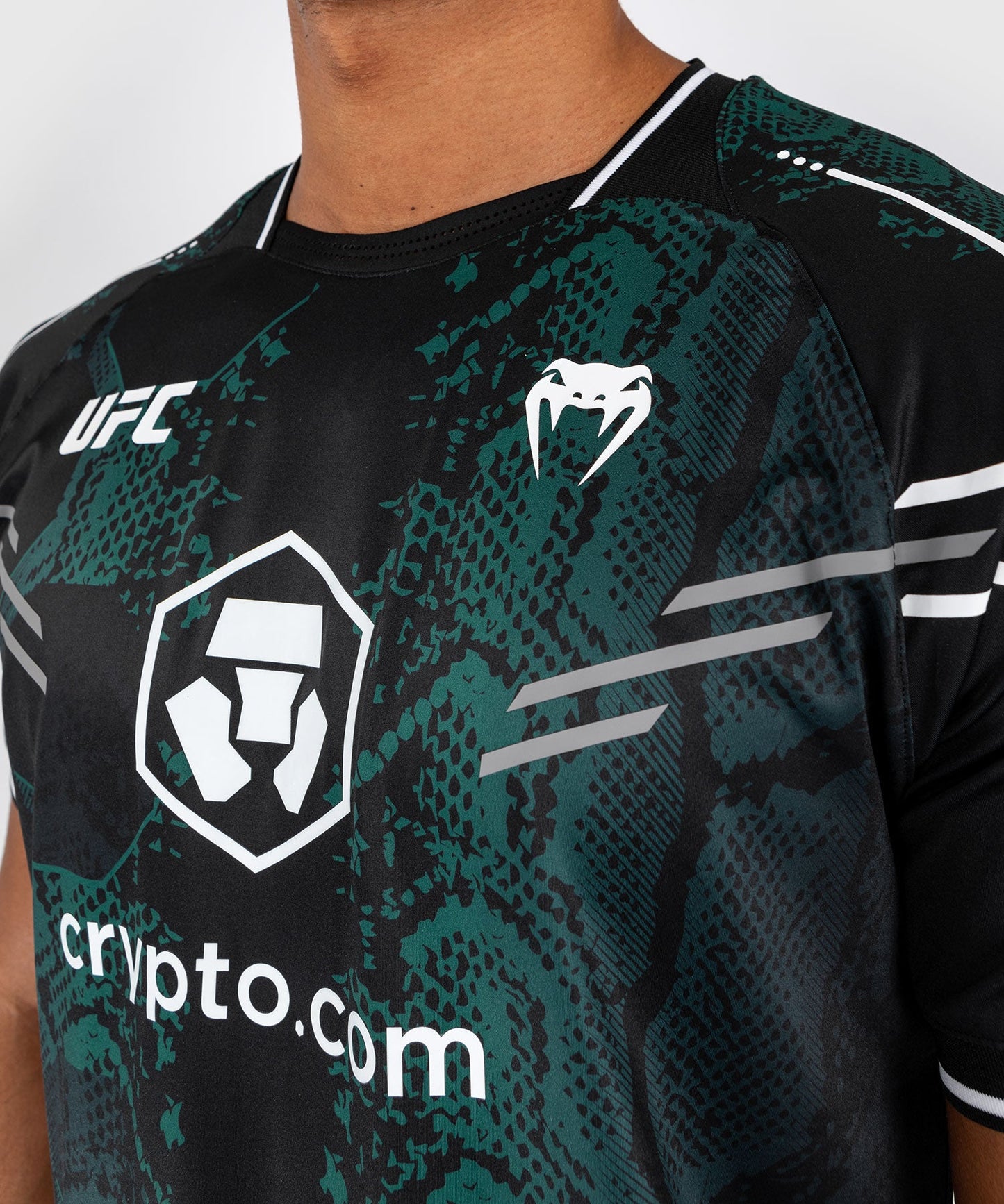 The bold design of this black jersey, with its emerald green snakeskin graphics and white logo, is a nod to the adrenaline experience of entering the Octagon.