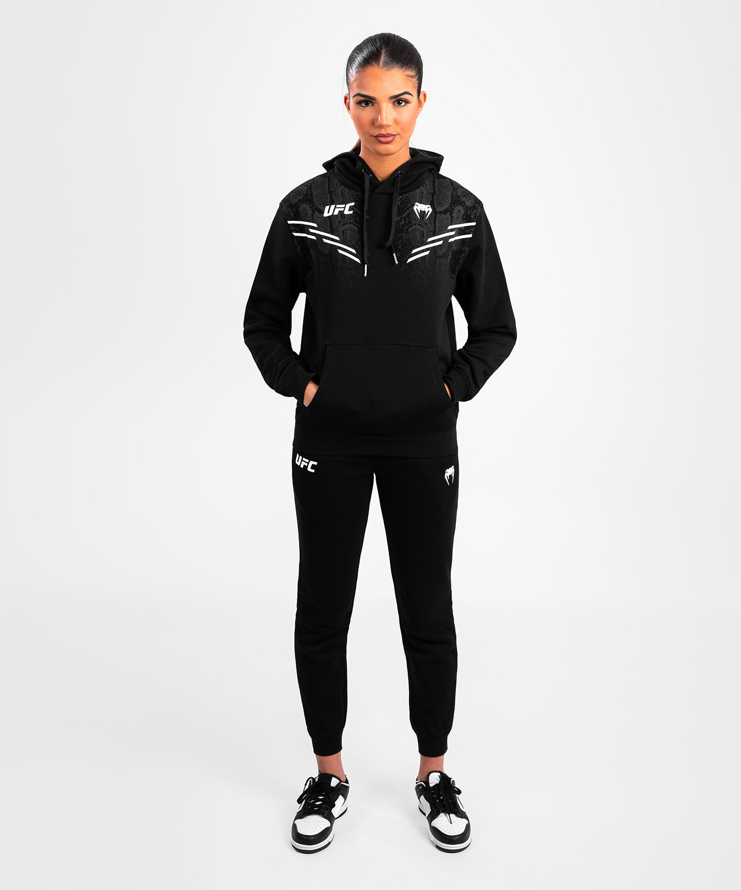 The UFC Adrenaline by Venum Replica Women’s Pullover Hoodie features subtle snakeskin graphics on the front shoulders and chest together with Venum and UFC white logo detailing.