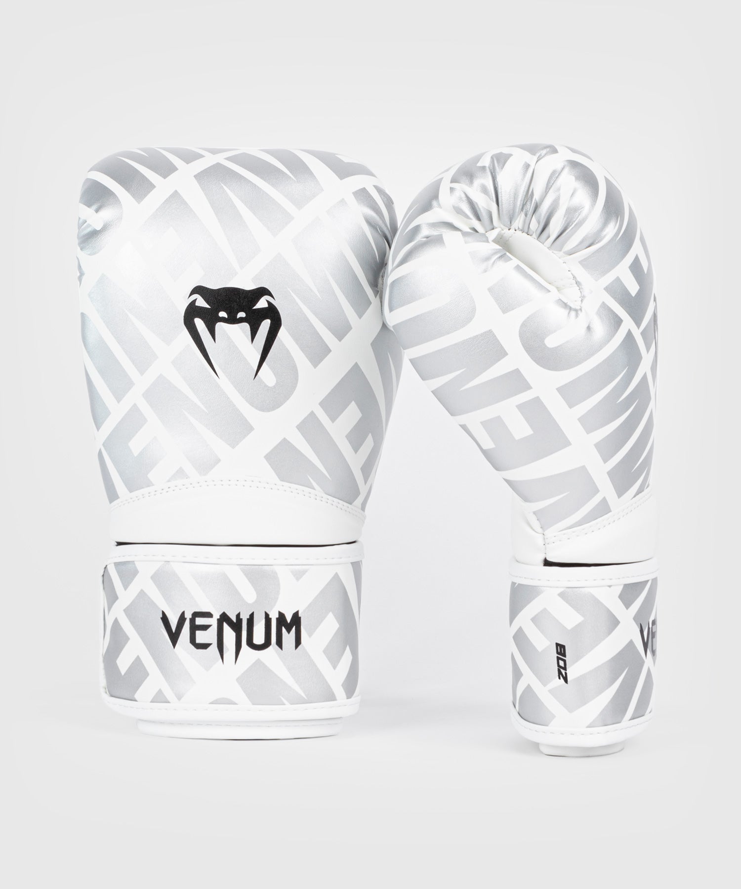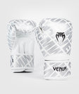 The Contender 1.5 XT White-Silver colorway features a silver logo motif across the glove and black Venum logos at the top of the hand and wrist. This model is also available in five other colorways.