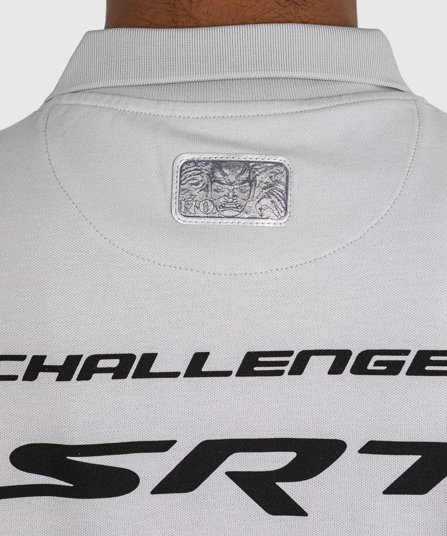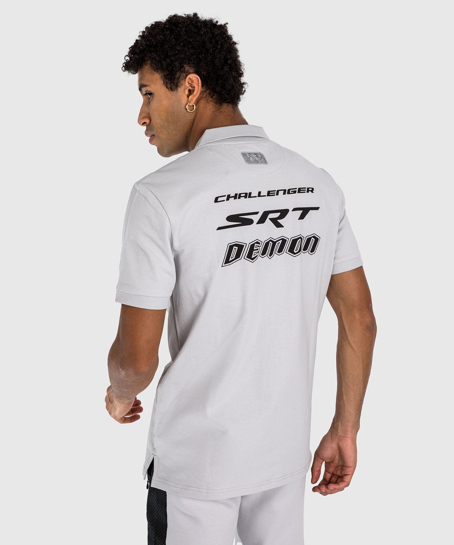 The Venum x Dodge Demon 170 Men's Polo Shirt in grey is a short-sleeved performance polo with a regular fit. The Venum logo is emblazoned in gray on the chest, and the Demon 170 x Venum logo is emblazoned on the right hip.