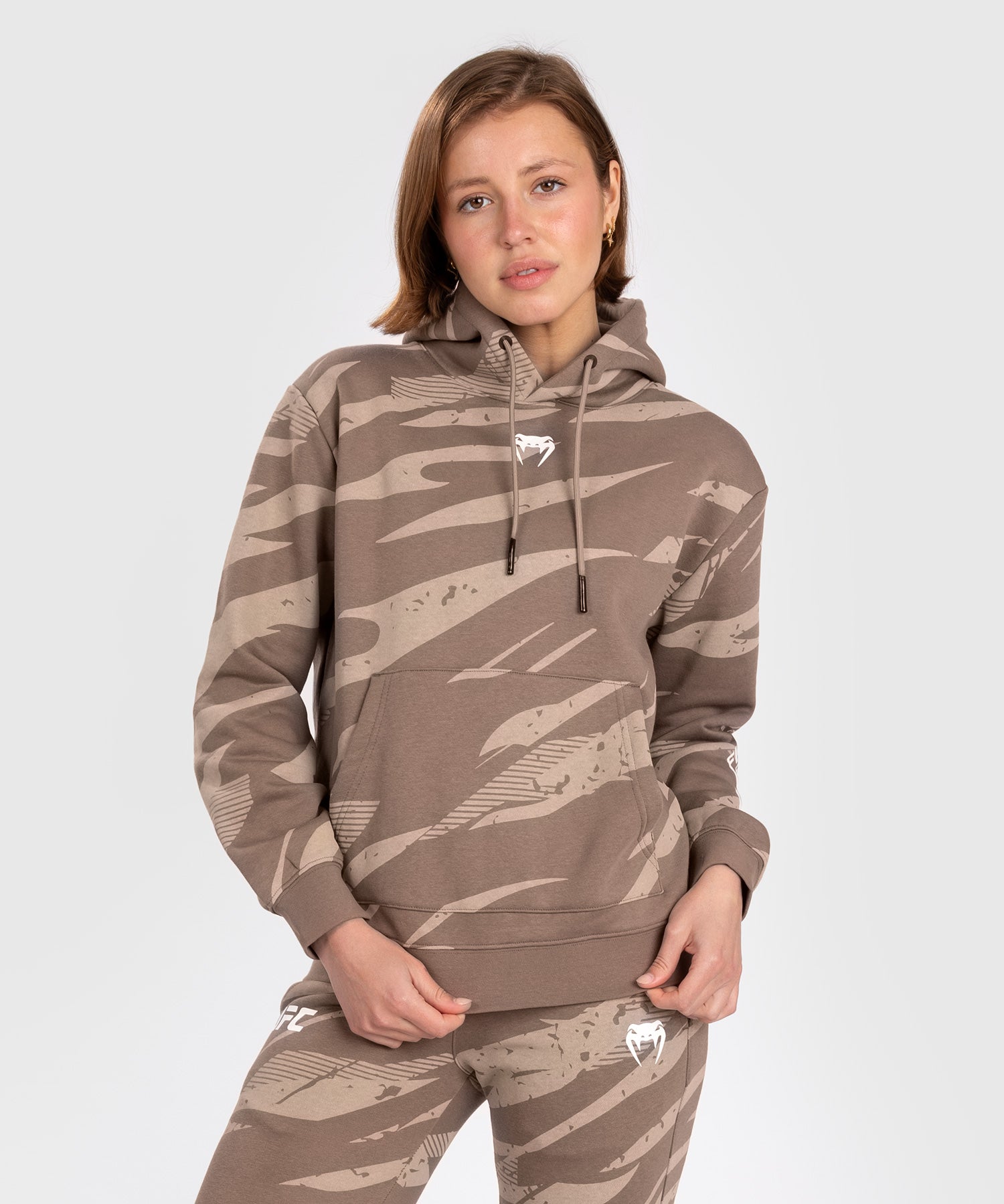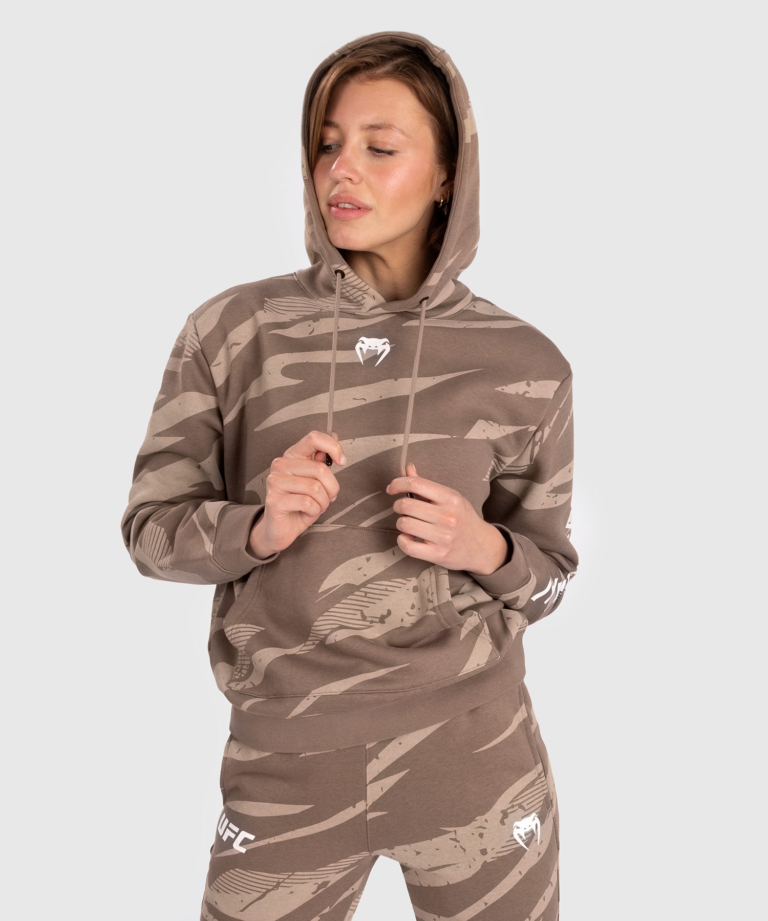 Venum's Fight Week UFC Adrenaline hoodie for women, in Desert Camo pattern, features Venum and UFC logo details in white on the chest, shoulder and along the left arm.