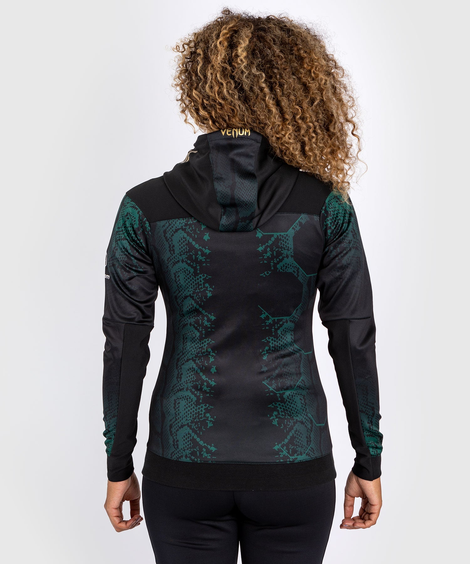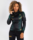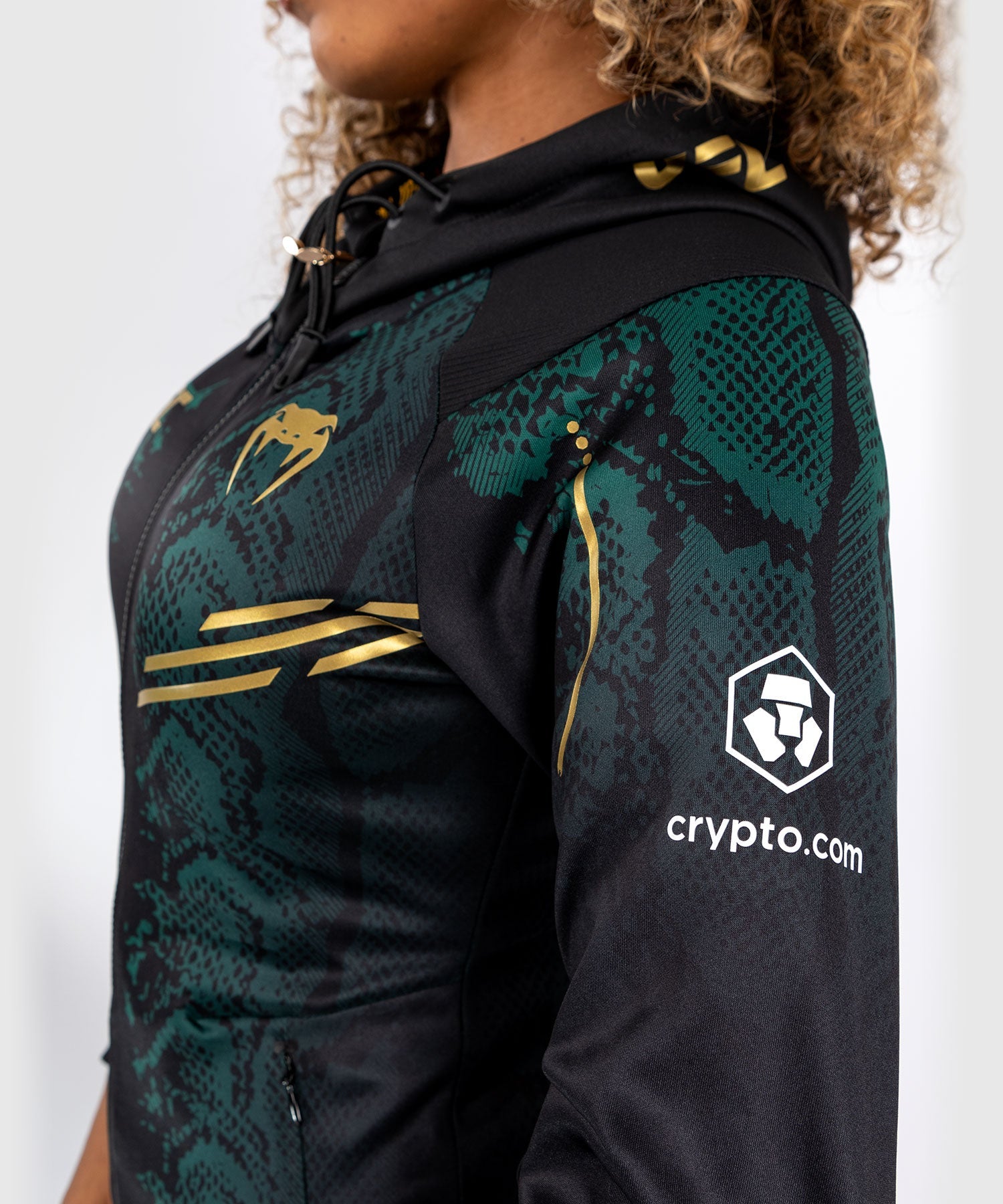 The women's UFC Adrenaline by Venum Authentic Fight Night Walkout Hoodie - Emerald Edition features two zipped pockets, plus a mesh hood with adjustable drawstrings. The cuffs and inner arm panel are made from premium stretch fabric, to enable female fighters to remove their hoodie without taking off their gloves.