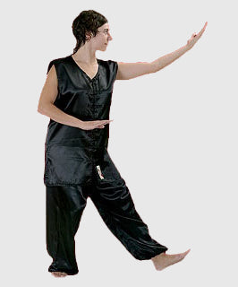 Un kimono de Kung Fu Fuji Mae sans manche très soigné. Il est fabriqué dans un satin noir de qualité.