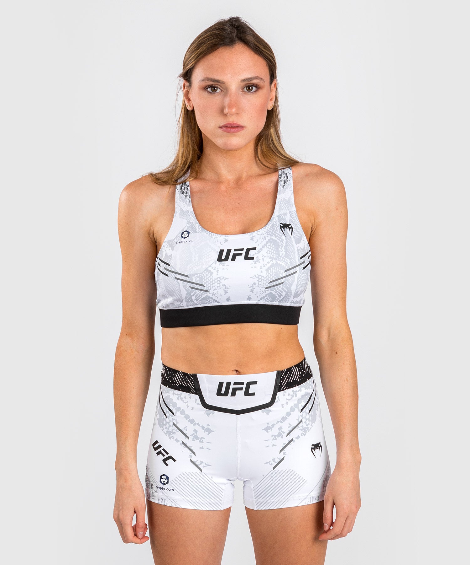 Le design audacieux de cette brassière de sport, avec ses motifs sublimés en peau de serpent et les détails des logos Venum et UFC en blanc, est un clin d'œil à l'expérience de l'adrénaline que l'on ressent lorsqu'on entre dans l'Octogone.