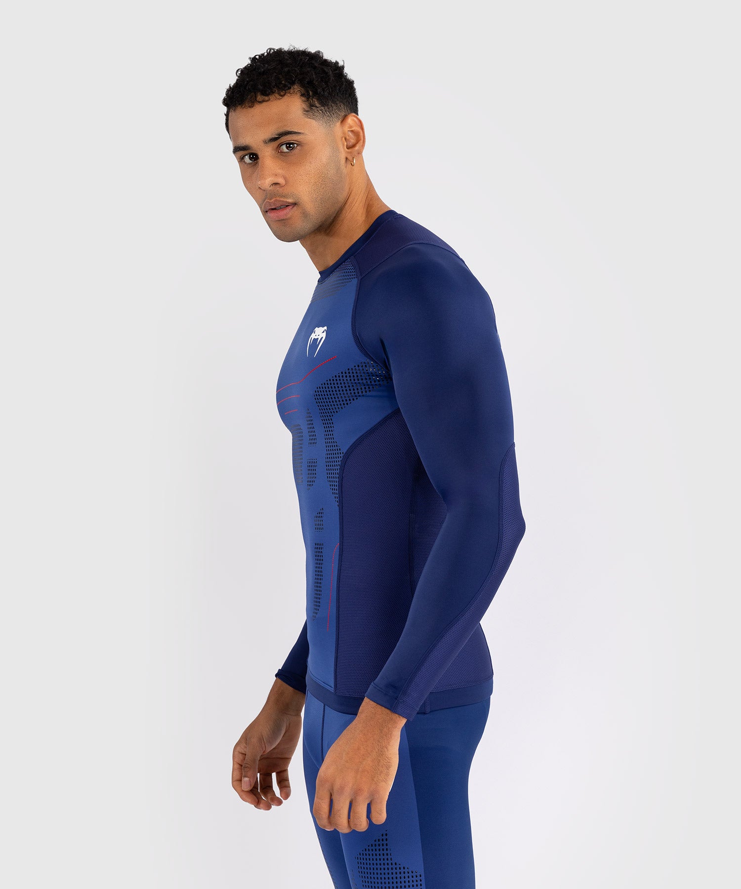 Le Rashguard à manches longues Venum Technique 3.0 en Bleu Nuit est un modèle compressif qui arbore un design futuriste élégant en bleu foncé et noir, avec le logo Venum sur la poitrine.