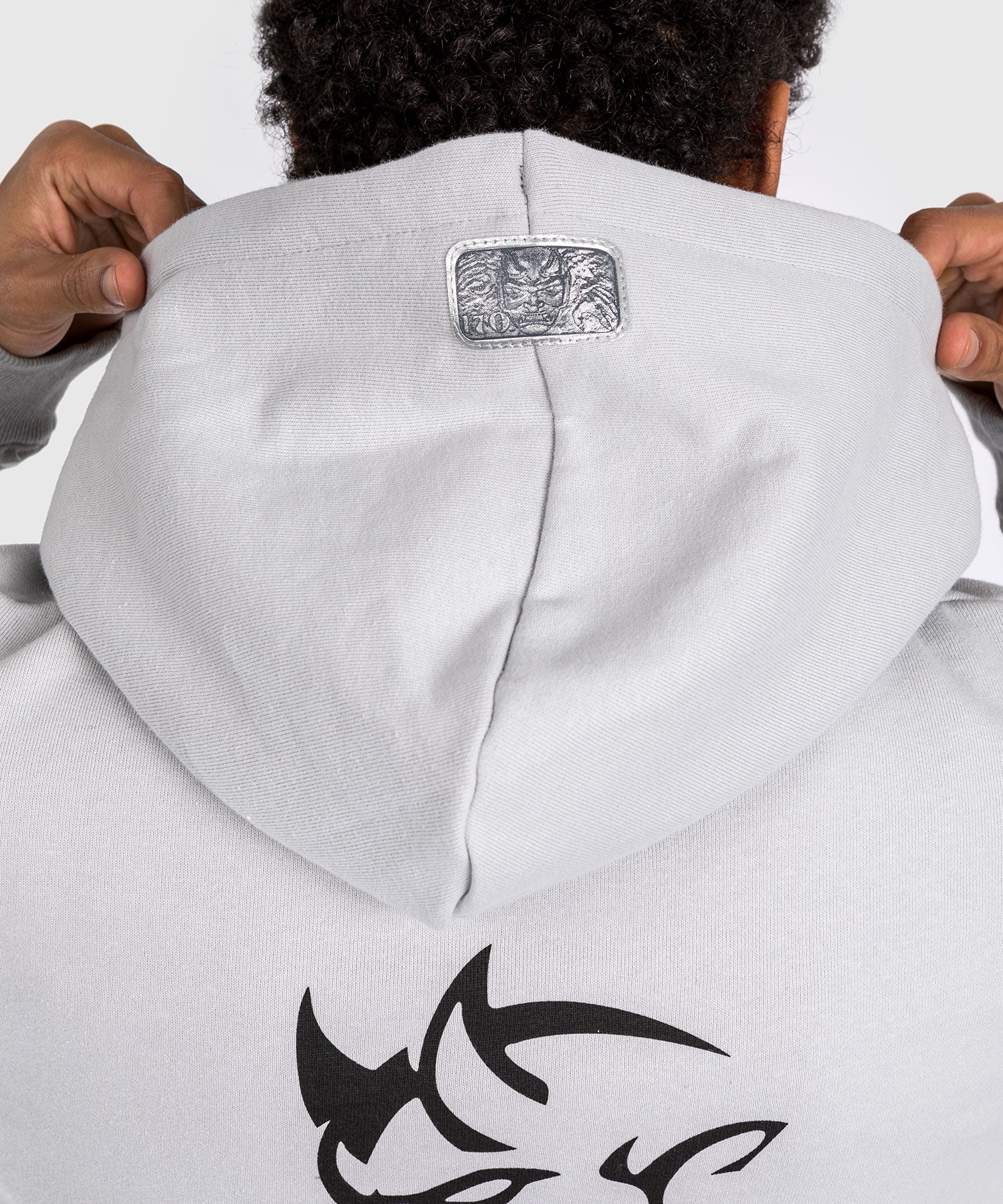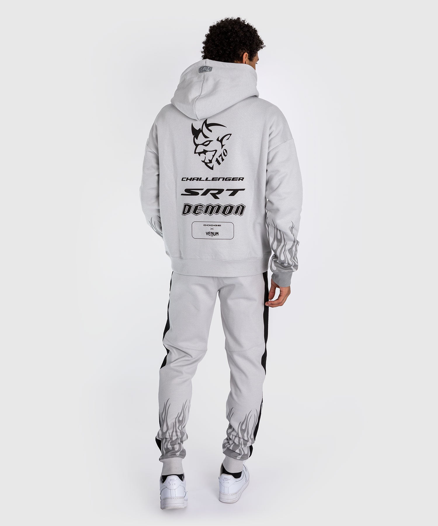 Le sweat à capuche Venum x Dodge Challenger SRT Demon 170 en gris est un sweat à capuche décontracté en coton épais 100 %. Il est doté d'une capuche à cordon de serrage et d'une poche frontale de type kangourou. Les flammes emblématiques de la Dodge Challenger remontent le long des deux bras, tandis que le logo Venum est apposé en noir sur la poitrine.
