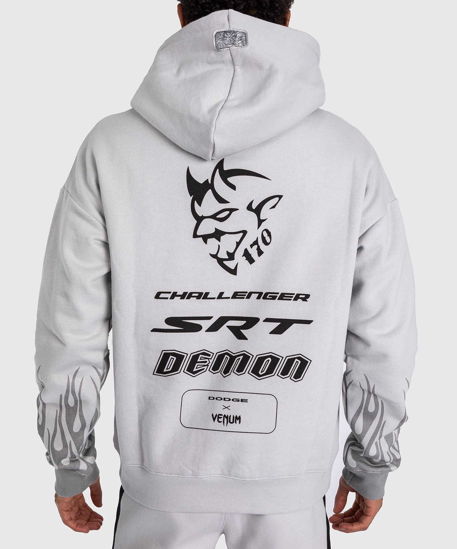 Un écusson métallique argenté est brodé sur le capot, imitant la plaque métallique présente sur le moteur de 1025 chevaux de la Demon 170. Les fans de Venum et de Dodge apprécieront également le logo Demon 170, les logos Challenger SRT et Dodge x Venum au dos du sweat à capuche.