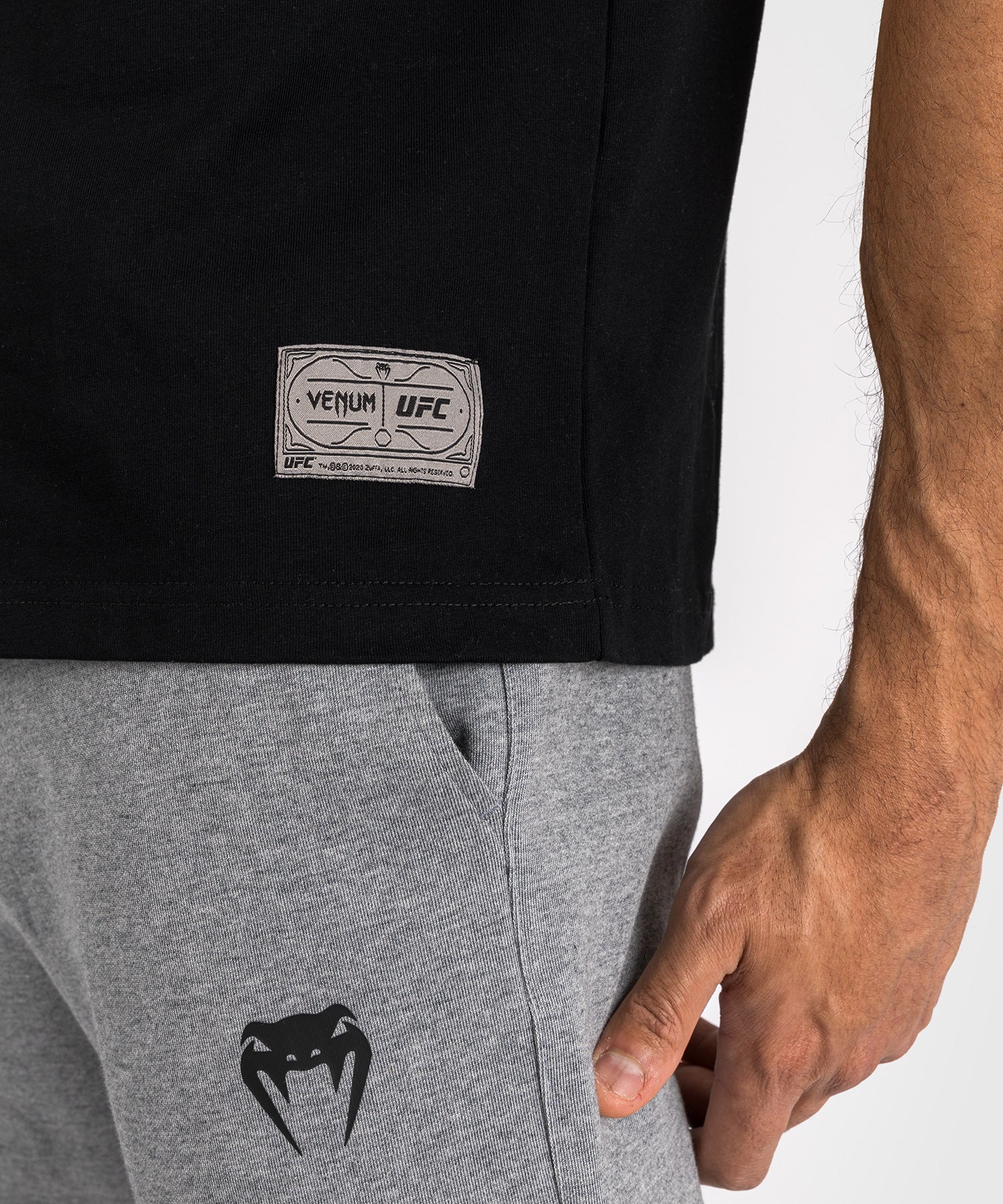 Sur ce T-shirt graphique noir à col ras du cou, le logo emblématique Ulti-Man en gris occupe le devant de la scène, tandis qu'un écusson de marque se trouve sur la hanche. Le logo Venum, également gris, est apposé dans le cou arrière.